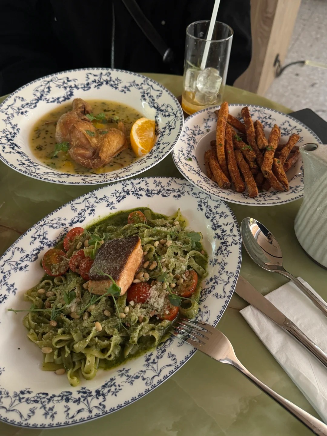 The menu mirrors the day-to-night experience. For brunch, the Big Breakfast is a hearty favorite with bacon, sausage, scrambled eggs, and thick-cut toast. Lighter options like the Truffle Mushroom Galette are crisp on the outside, silky inside, with fragrant truffle aroma. Evening mains include Confit Chicken Leg with Tarragon, juicy and herb-infused, or Fish & Chips, golden and crisp on the outside, tender inside. Desserts like Madeleine or Tiramisu provide a sweet and refined conclusion.