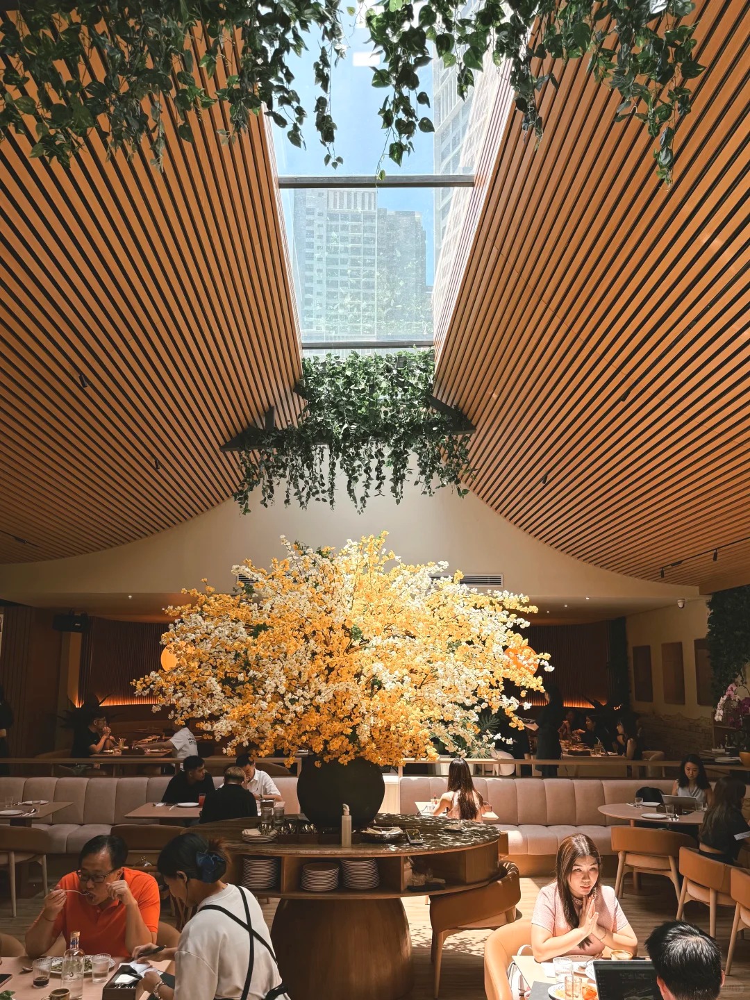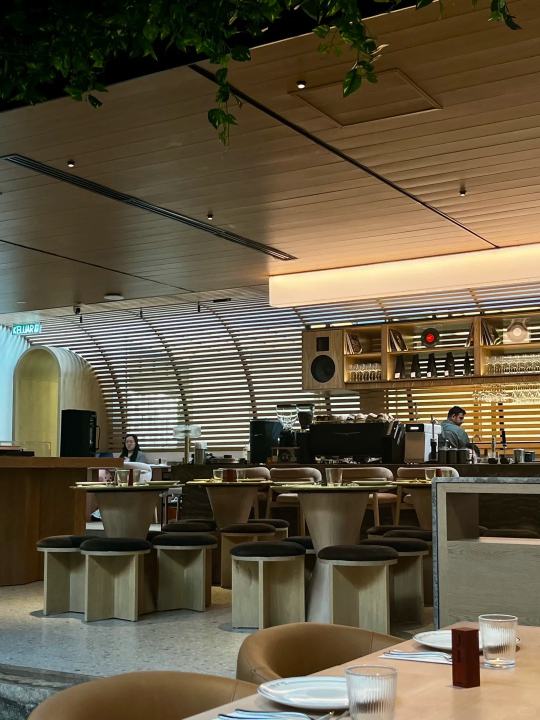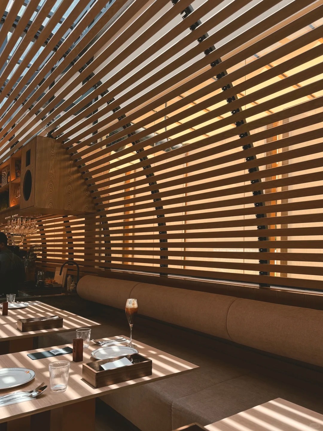 From the moment you step inside, you’re immersed in a space that changes with the day. During daylight hours, sunlight streams through skylights, highlighting warm wood tones and airy accents, creating an inviting environment. As night falls, soft tungsten lighting, textured materials, and gentle music transform the room into an intimate half-bistro, half-lounge. The concept of “sun to moon” is reflected throughout, giving each corner a subtle, evolving charm.